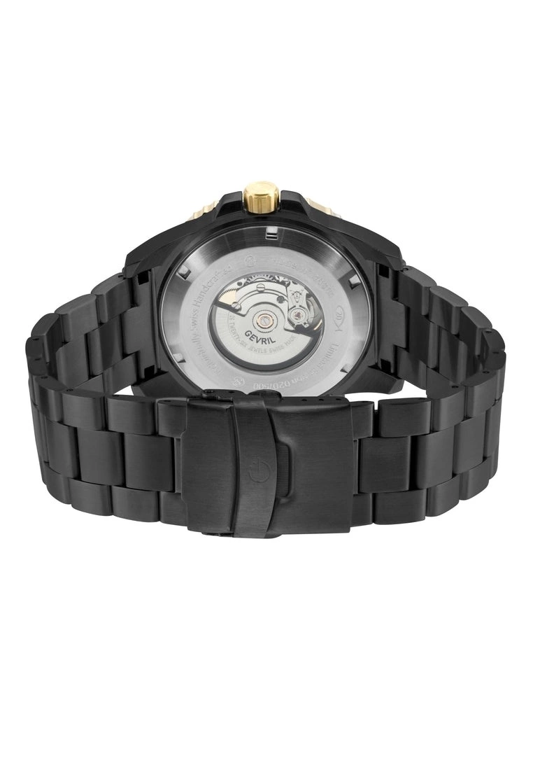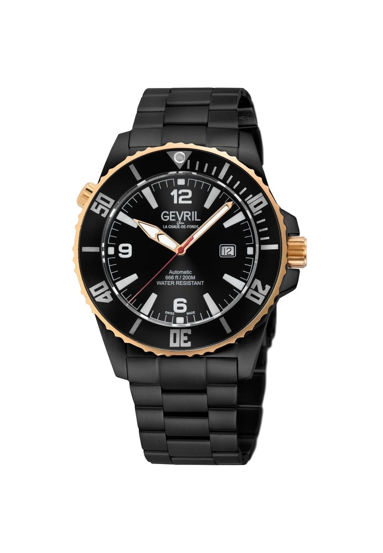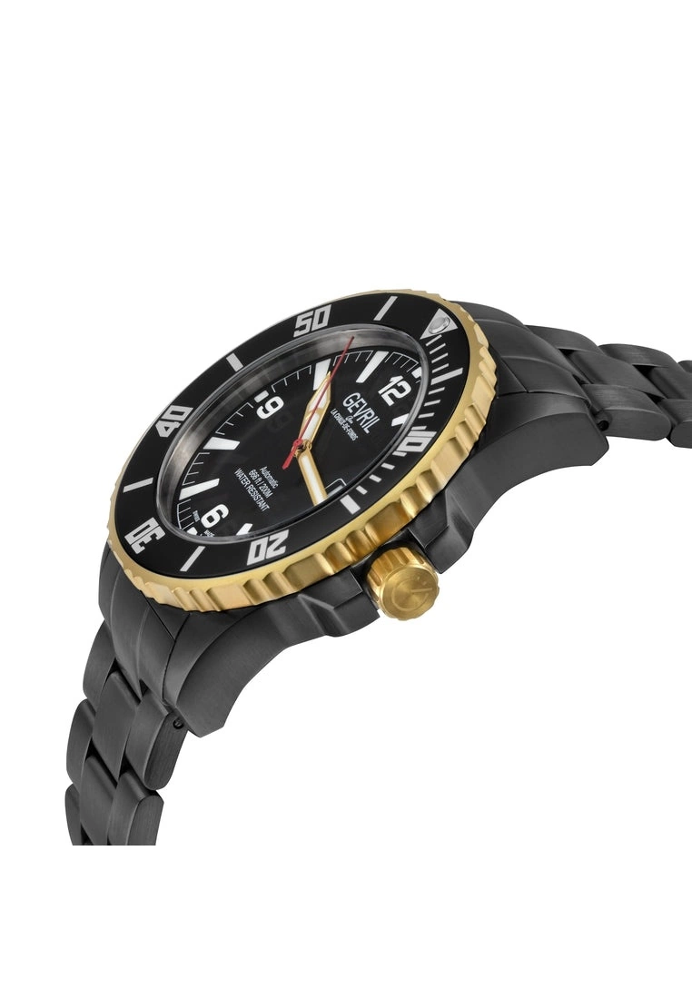 Gevril Men’s Swiss Automatic Men’s watch from the Canal St Collection46mm Round Solid Steel Case, Black Bezel Gold Trim, Black DialRotating Bezel, Helium ValveDate Display at 3 O’clock, BGW9 Luminous Numbers and Indices
