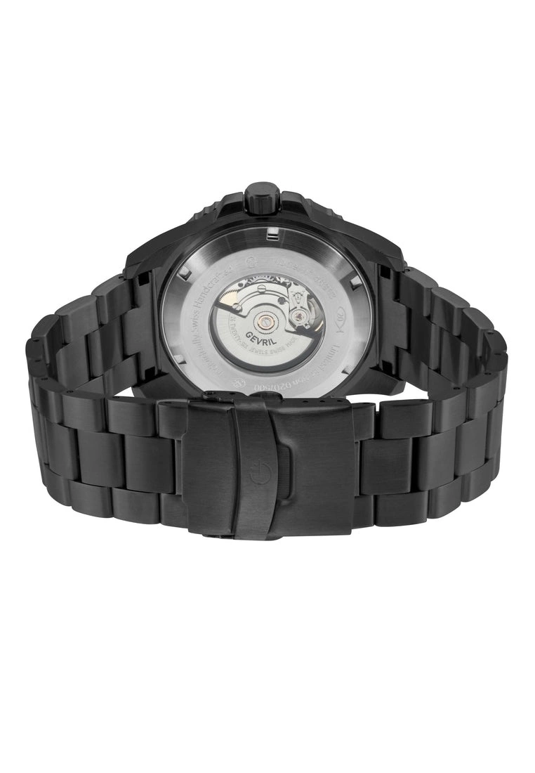 Gevril Men’s Swiss Automatic Men’s watch from the Canal St Collection46mm Round Solid Steel Case, Black Bezel, Black DialRotating Bezel, Helium ValveDate Display at 3 O’clock, BGW9 Luminous Numbers and Indices