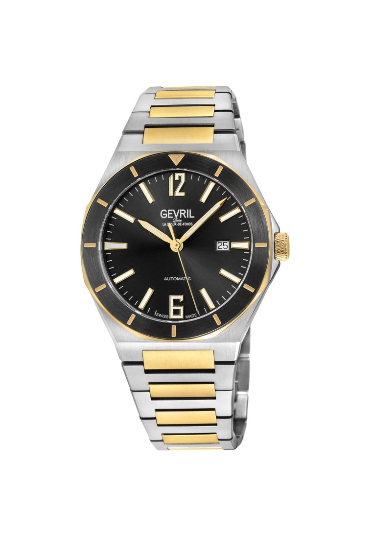 Gevril Men’s High Line Automatic Watch Stainless Steel Case, Top ring in Black Sapphire Crystal, Two toned Stainless Steel IPYG Bracelet