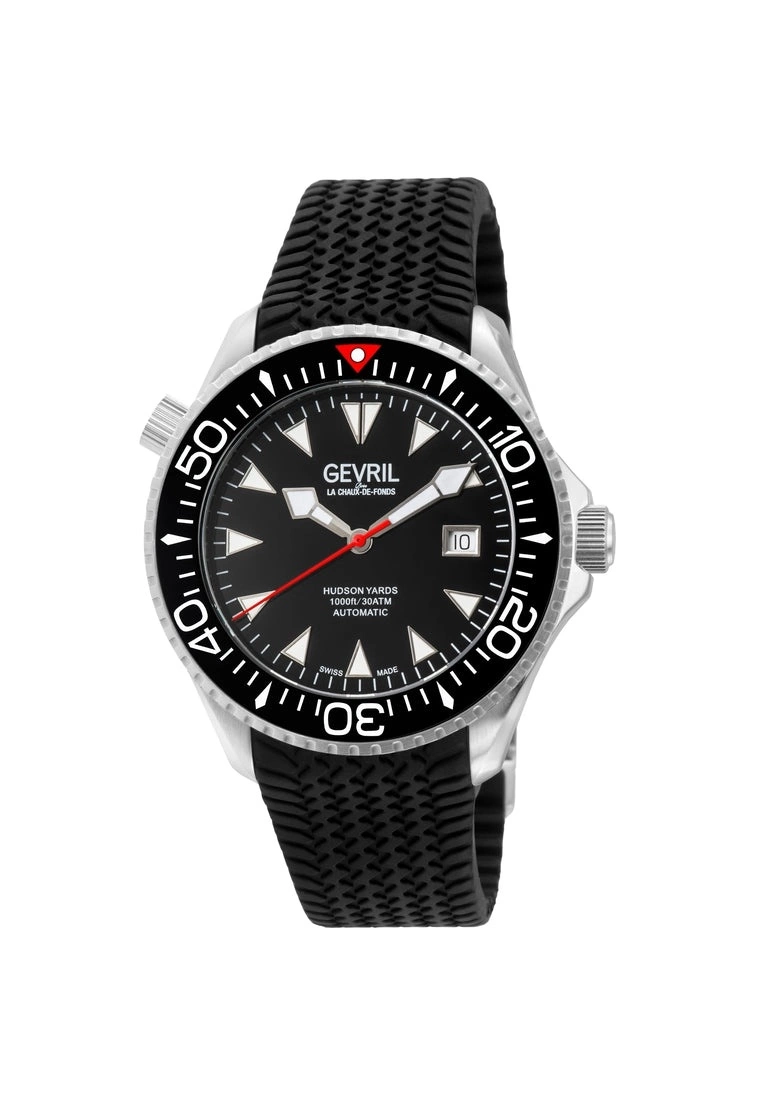 Gevril Men’s Swiss Automatic Watch from the Hudson Yards Collection43mm Stainless Steel Case Black Ceramic Ring, Black Dial, date at 3 o’clockUnidirectional Rotating bezel, Screw down helium release valve, Luminous MarkersExhibition Case back, Screw Down CrownGenuine Black Rubber Strap with Tang BuckleAnti-reflective Sapphire CrystalWater Resistant to 300 Meters/30ATMSwiss Automatic 3 Hands, SW200 Movement