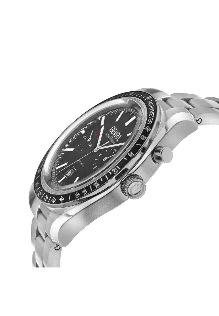 Gevril Men’s Swiss Automatic watch from the Lenox Collection44mm 316L Stainless Steel Case, Black Dial with Exhibition Case BackDay/Date, Screw down crown, Luminous Hands and MarkersTachymeter, multi-function month day and date indicator316L Stainless Steel bracelet With Deployment BuckleAnti-reflective Domed CrystalWater Resistant to 50 Meters/5ATMSwiss Automatic Movement