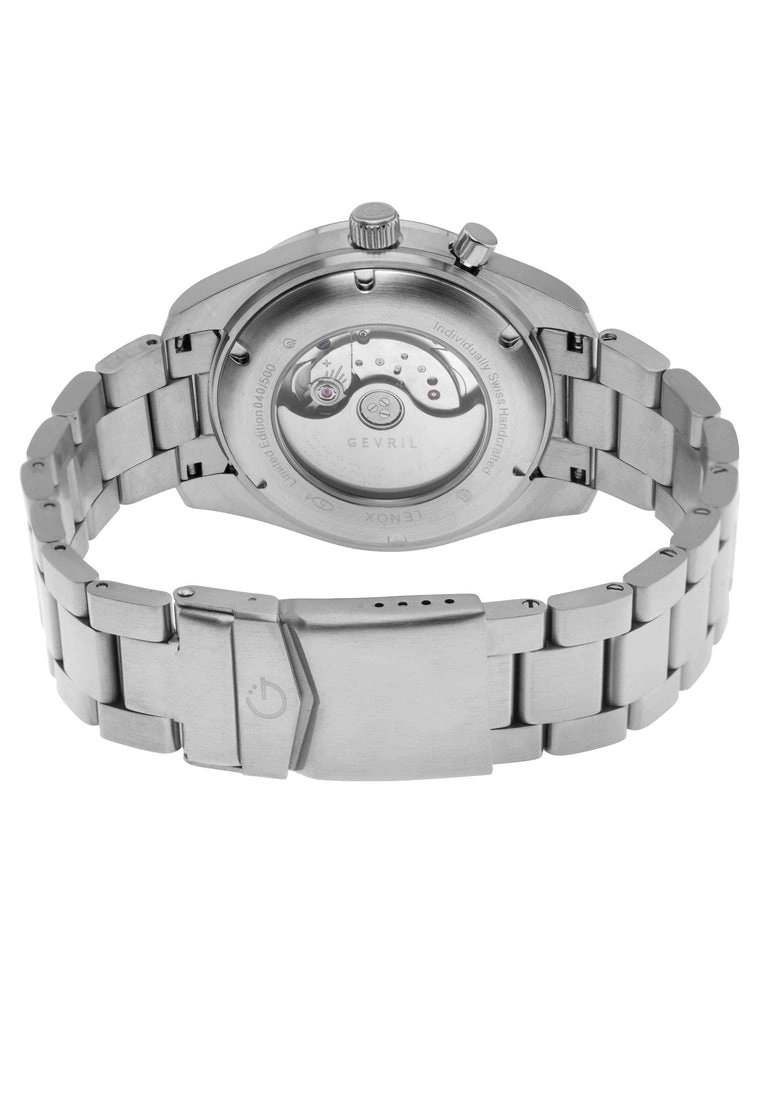 Gevril’s newest Lenox collection epitomizes what it means to be a luxury and a staple. Holding two ideas at once, the Lenox is stunning in its simplicity, bold in its design. Sturdy and reliable while oozing upscale confidence and zeal, this is Lenox. High-end watches need not be staid, and Lenox is anything but. After its Manhattan namesake, the collection is rich in history featuring Swiss Automatic Movement and culturally prominent with its tachymeter, multi-function month, day and date indicator. Perfect for putting on the Ritz or taking in the jazz scene, this collection is charming in its masculine ease. The 44mm stainless steel case with exhibition back speaks to the past while the day/date window and luminous hands and markers call to the future. Lenox is a grand timepiece with little time for ostentatiousness because while money talks, wealth whispers. An affluent take on deep cultural roots, Lenox is a daily testament to who you aspire to be.Specifications