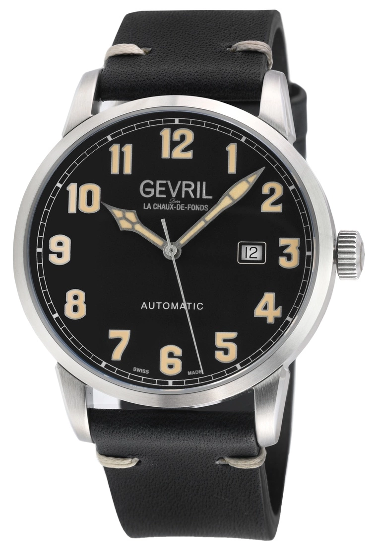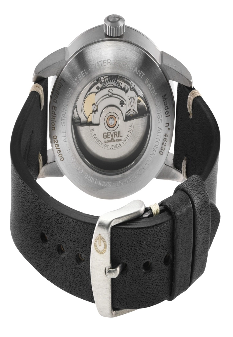 SpecificationsGevril 46230 Men’s Vaughn Swiss Automatic WatchGevril Men’s Swiss Automatic Men’s Watch from the Vaughan Collection42mm Round 316L Stainless Steel Case with Exhibition Case Back window, Black DialDate Display at 3 O’clock Luminous Hands And IndicesPush Pull CrownGenuine Italian Black Leather White Stitching with Tang BuckleAnti-reflective Sapphire CrystalWater Resistant to 50 Meters/5ATMSwiss Made Automatic, Sellita SW200 Movement