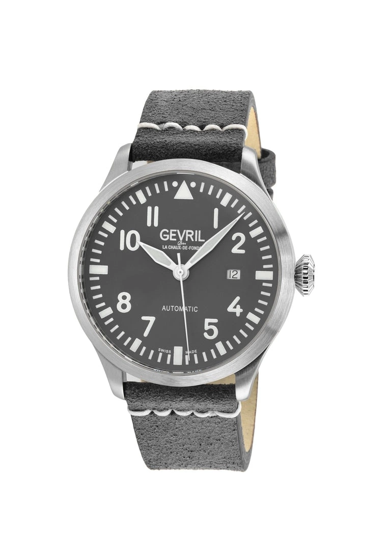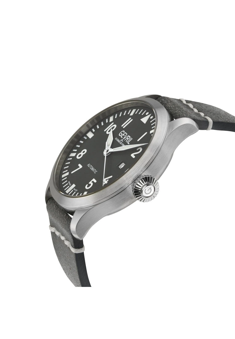 SpecificationsGevril 43505 Men’s Vaughn Swiss Automatic WatchGevril Men’s Swiss Automatic Men’s Watch from the Vaughan Collection44mm Round 316L Stainless Steel Case, Gray Dial, Luminous HandsDate at 3 o’clock, Exhibition Case backPush Pull CrownGenuine Italian Grey Leather Strap with Tang BuckleAnti-reflective Sapphire CrystalWater Resistant to 50 Meters/5ATMSwiss Made Automatic, Sellita SW200 Movement