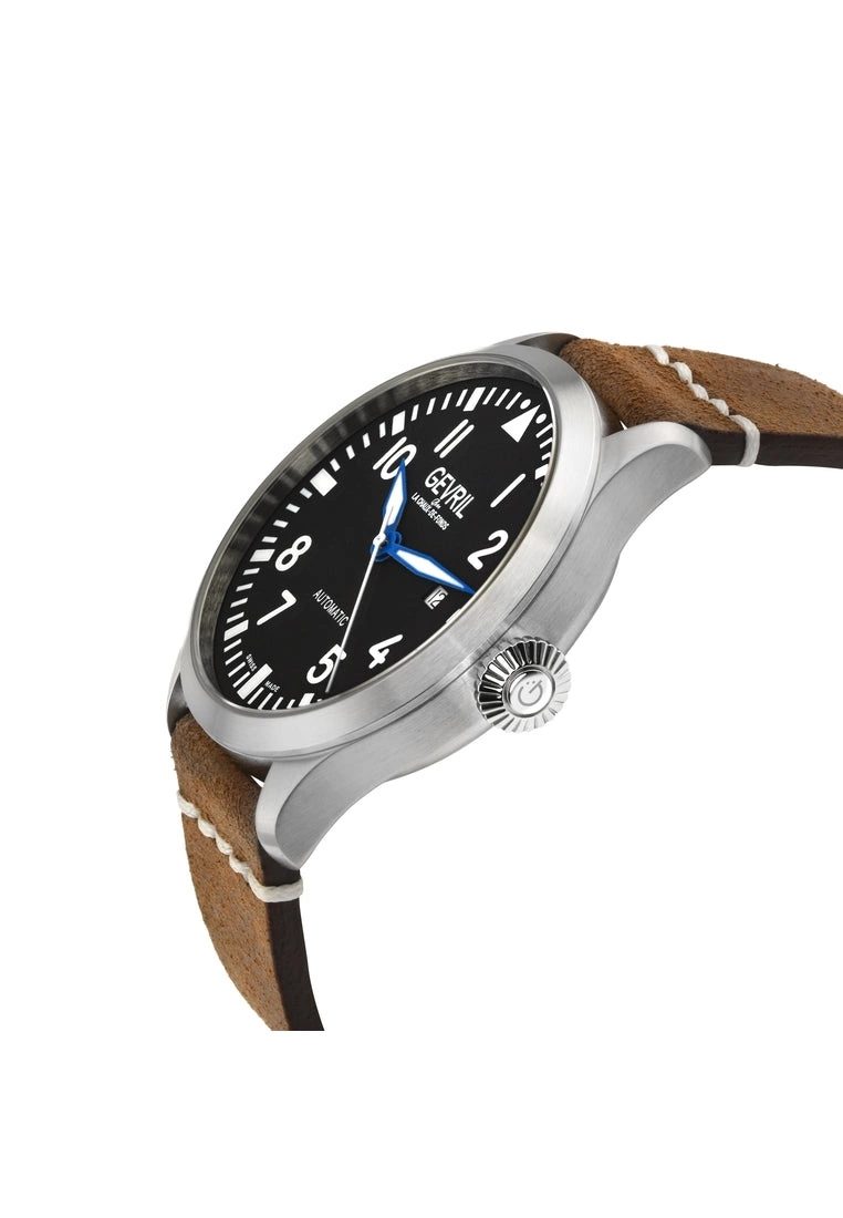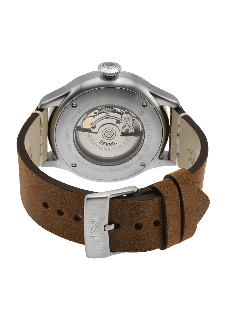 SpecificationsGevril 43504 Men’s Vaughn Swiss Automatic WatchGevril Men’s Swiss Automatic Men’s Watch from the Vaughan Collection44mm Round 316L Stainless Steel Case, Black Dial, Luminous HandsDate at 3 o’clock, Exhibition Case backPush Pull CrownGenuine Italian Brown Leather Strap with Tang BuckleAnti-reflective Sapphire CrystalWater Resistant to 50 Meters/5ATMSwiss Made Automatic, Sellita SW200 Movement