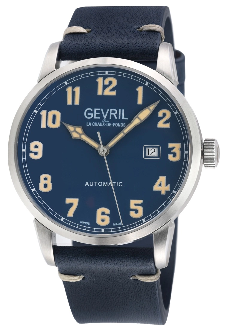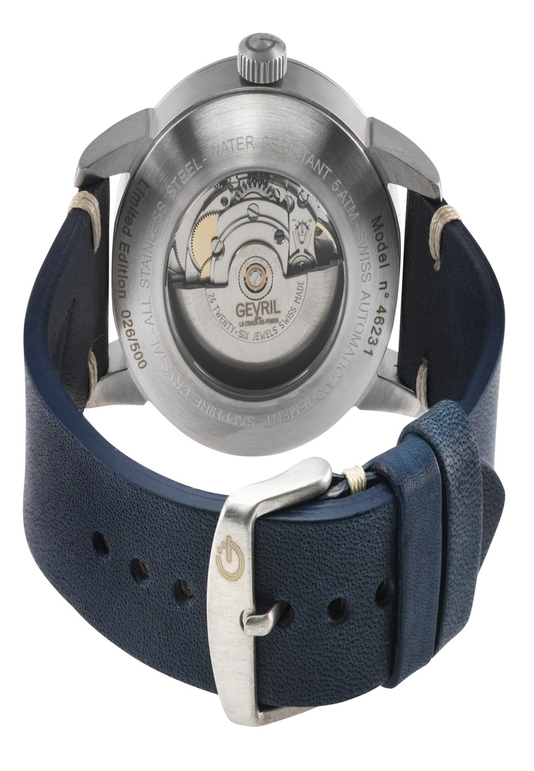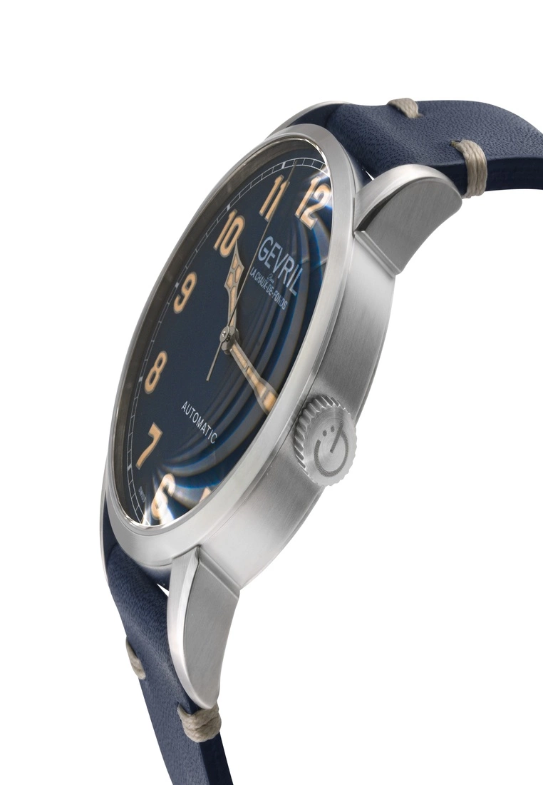 SpecificationsGevril 46231 Men’s Vaughn Swiss Automatic WatchGevril Men’s Swiss Automatic Men’s Watch from the Vaughan Collection42mm Round 316L Stainless Steel Case with Exhibition Case Back window, Blue DialDate Display at 3 O’clock Luminous Hands And IndicesPush Pull CrownGenuine Italian Blue Leather White Stitching with Tang BuckleAnti-reflective Sapphire CrystalWater Resistant to 50 Meters/5ATMSwiss Made Automatic, Sellita SW200 Movement