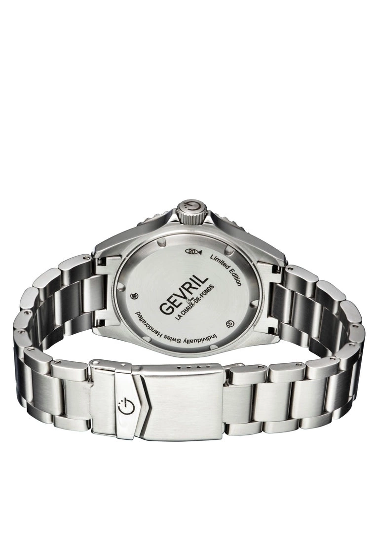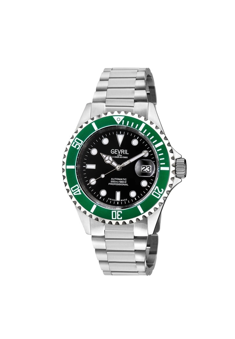 ectional rotating bezelScrew down Crown with Gevril LogoLuminous indices on dial, Luminous hands, Black Dial, Green CeramicĀ BezelDate at 3 o’clock Magnified Lens316L Stainless Steel Oyster Bracelet with folding Deployment BuckleAnti-reflective Sapphire CrystalWater Resistant to 200 Meters/20 ATMSwiss Automatic 3 Hands, SW200 Movement