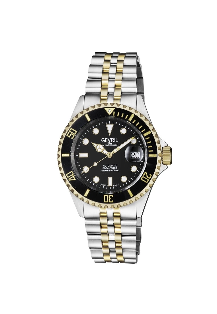 43mm 316L Stainless Steel Satin finish case, Unidirectional rotating bezelScrew down Crown with Gevril LogoLuminous indices on dial, Luminous hands, Black DialDate at 3 o’clock Magnified LensTwo-toned SS/IPYG Jubilee Bracelet with folding Deployment BuckleAnti-reflective Sapphire CrystalWater Resistant to 200 Meters/20 ATMSwiss Automatic Sellita SW200