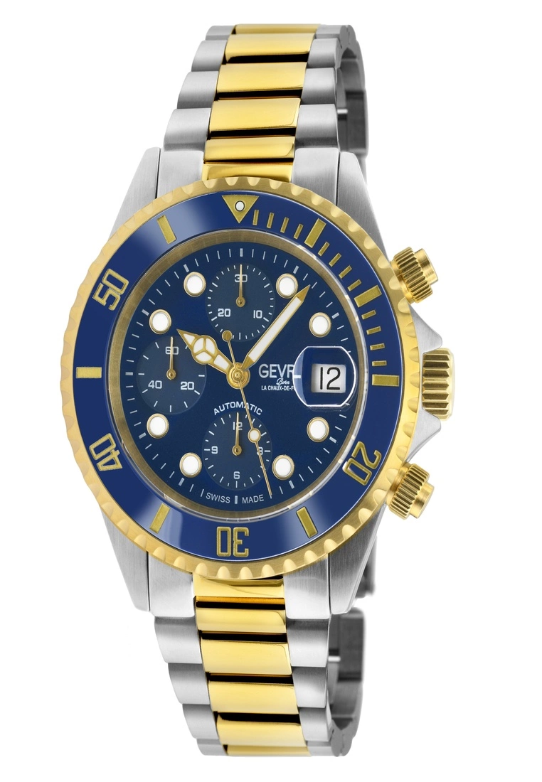 Gevril Men’s Wall Street Chrono Blue Dial Blue Ceramic Bezel Two toned IPYG 316L Stainless Steel Bracelet