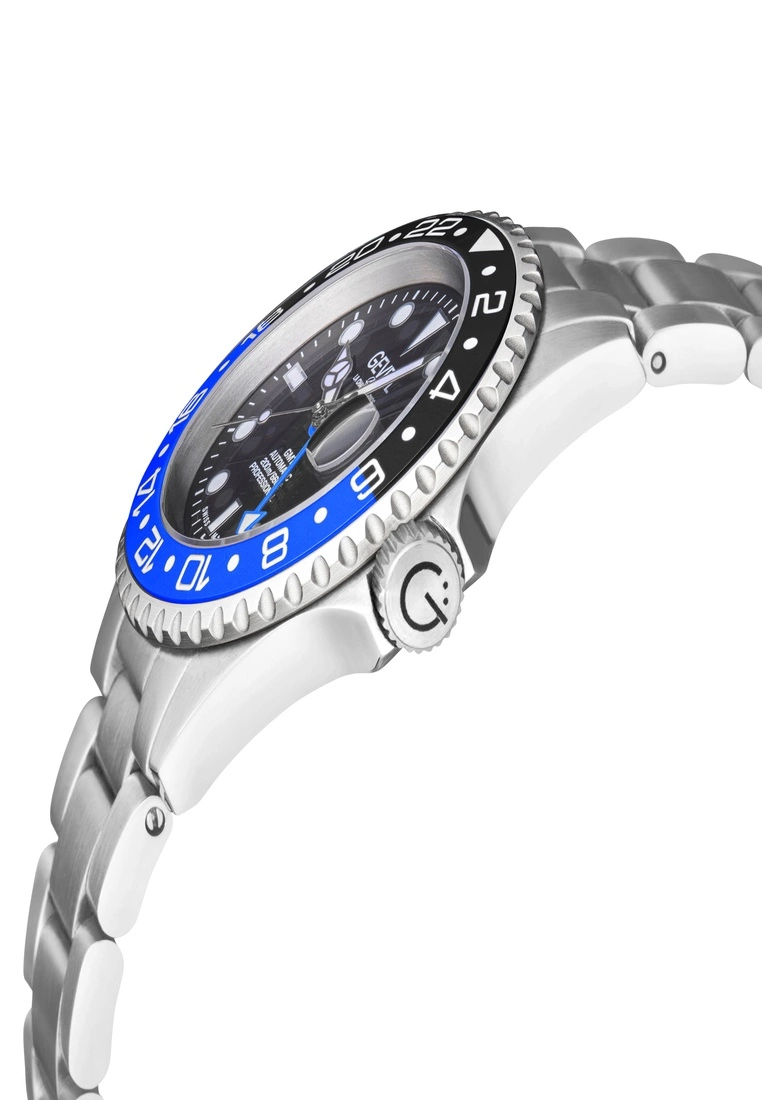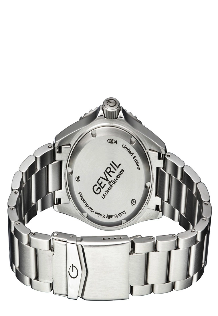 43mm 316L Stainless Steel Satin finish case, Unidirectional rotating bezelScrew down Crown with Gevril LogoLuminous indices on dial, Luminous hands, GMT Black Dial, Black/Blue Ceramic BezelDate at 3 o’clock Magnified LensStainless Steel Bracelet with folding Deployment BuckleAnti-reflective Sapphire CrystalWater Resistant to 200 Meters/20 ATMSwiss Automatic GMT, SW330 Movement