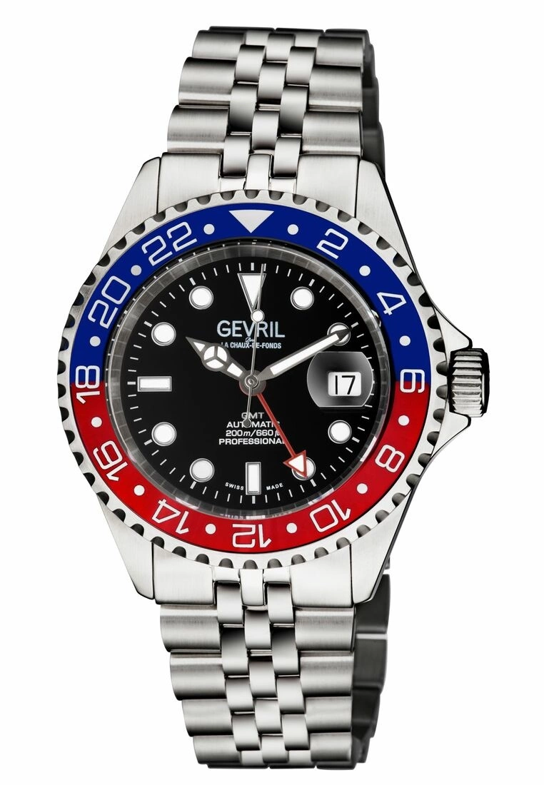 Gevril Swiss watch from the Wall Street Collection43mm 316L Stainless Steel Satin finish case, Unidirectional rotating bezelScrew down Crown with Gevril LogoLuminous real indices on dial, Luminous hands, Blu/Red Ceramic BezelDate at 3 o’clock, Magnified LensSapphire Anti-glare Crystal 316L Stainless Steel Jubilee Bracelet with folding Deployment ClosureWater resistant to 200 Meters/20 ATMSwiss Automatic GMT, SW330 Movement