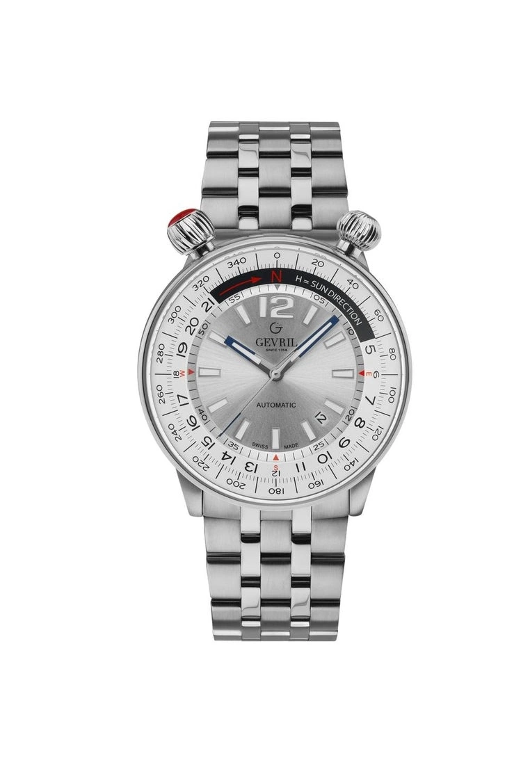 Gevril Men’s Swiss Automatic from the Wallabout Collection44mm Round Stainless Steel Case, Luminous Hands and Hour MarkersDate display at 4:00 and 5:00Two unique crowns – Right sets time, Left sets solar compass316L Stainless Steel Bracelet With Deployment BuckleAnti-reflective Sapphire CrystalWater Resistant to 50 Meters/5ATMSwiss Automatic Movement