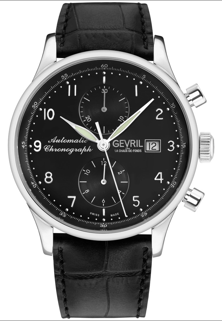 Gevril Men’s Swiss Automatic Men’s Watch from the West Side Collection42mm Round 316L Stainless Steel Case with Exhibition Case Back windowDate Display at 3 O’clock Luminous Hands, Limited Edition on side of caseGenuine Calfskin Black Leather with Tang BuckleAnti-reflective Sapphire CrystalWater Resistant to 50 Meters/5ATMSwiss Automatic Movement ETA 7750
