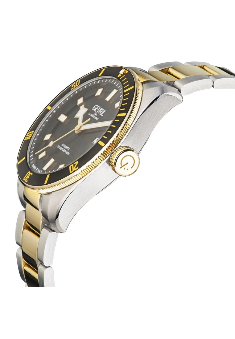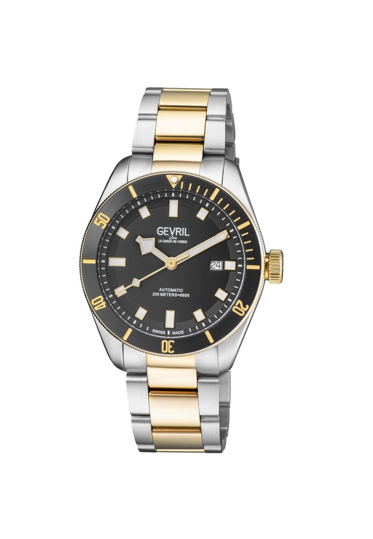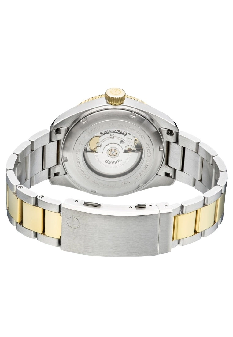 Gevril Men’s Swiss Automatic from the Yorkville Collection43mm 316L Stainless Steel Case with Black Dial, Unidirectional Rotating BezelDate at 3 o’clock, Screw Down Crown, Exhibition Case backExhibition Case back, Screw down CrownTwo-toned 316L Stainless Steel IPYG Bracelet with Deployment BuckleAnti-reflective Sapphire CrystalWater Resistant to 200 Meters/20 ATMSellita SW200, Swiss Automatic Movement